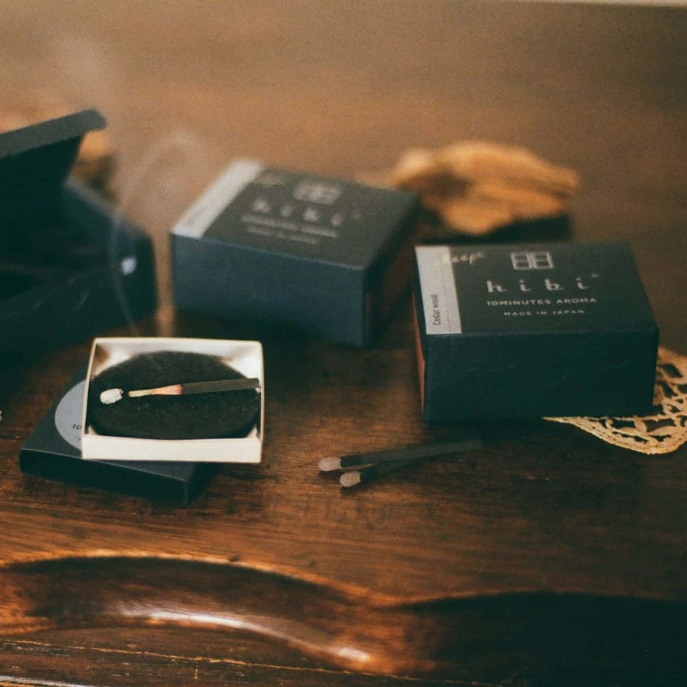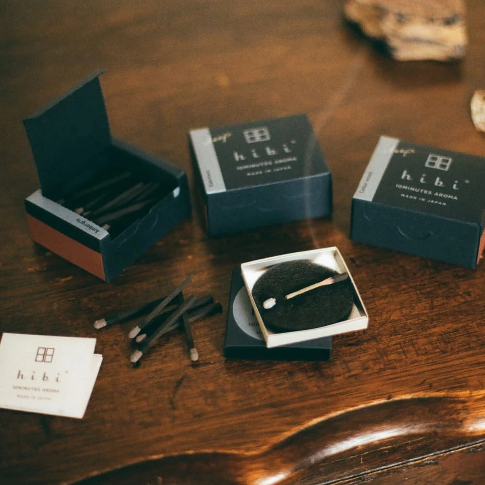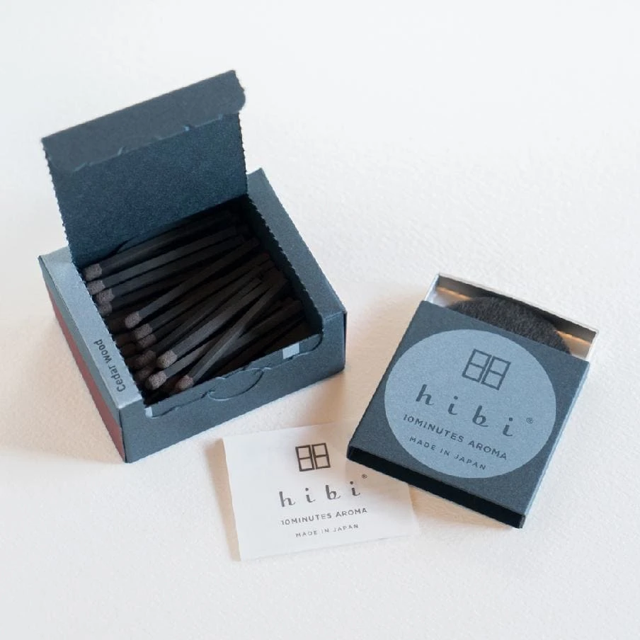 Hibi incense 10 minute aroma started with a match factory and an incense factory on a mission: to create a new product from two crafts. The result is a collection of incense matchsticks. No wood is used, it is pressed incense powder. Japanese incense is usually very brittle, so hibi uses a bit of washi pulp to make it strong enough to strike.