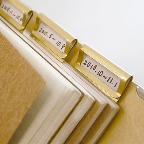 Il s’agit de clips dans lequel vous pouvez insérer un morceau de papier sur lequel est inscrit un titre ou une date. Ces clips peuvent être utilisés comme index d’un cahier et servir d’organisateur pour trier vos documents et cartes de visite. Il convient de mentionner que le cadre lui-même fonctionne comme un clip, donc si vous le placez sur la couverture, il se transforme également en cadre pour étiquettes…